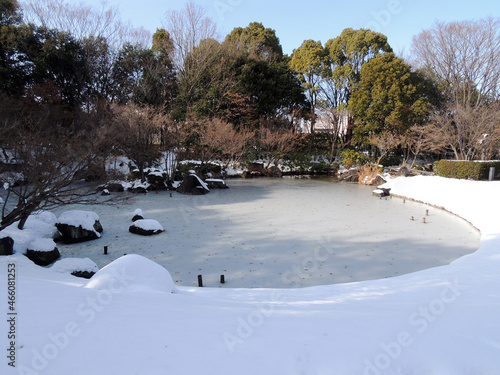 garden, garden, japanese garden, mere, glacé, ice, winter, daytime, shadow, snow, snow, wood, season, landscape, japan, blue, ice, leaf, white, green, blue skies, cold, brown, sky, frieze