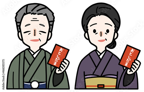 illustration, vector, grandfather, nanny, grandfather, grandparent, gold, money, kimono, celebration, new year's day, new year, grandfather, babushka, grandmother, aged, aged, aged, people, waist up, smile, front, woman, man, family, pretty, sweet, white background