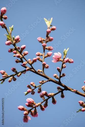 flower, peach, pink, pink, plant, wood, spring, season, bloom, pretty, sky, blue skies, background