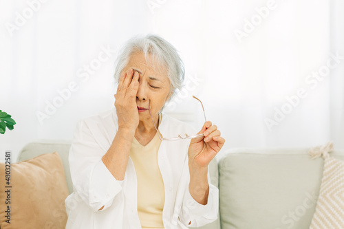 aged, glasses, eye, unseen, eye, fatigue, painful, woman, myopia, blur, farsighted, fatigue, aged, cephalalgia, astigmatism, aged, nanny, babushka, elderly, home, grandmother, couch, house, room, indoor, japanese, asian, people