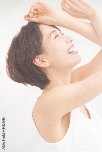 beauty, portrait, woman, 30s, japanese, smile, health, joyful, relax, mental health, happy, beauty, skincare, short hair, asian