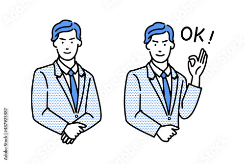 スーツにネクタイ姿のビジネスマンのマルバツやオッケーなどの表情バリエーションの白背景に線画のシンプルなイラスト
