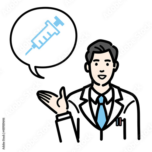 ワクチン、予防接種の説明をしている白衣を着た若い男性医師
