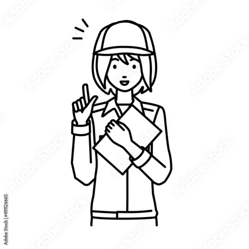 point, hint, flair, business, aware, idea, work, workwear, improvement, transport, understanding, white background, cut-out, illustration, vector, flat, forefinger, document, board, work, people, woman, 30s, front, waist up, stood, smile, checking, safe, cleaning, hat, fix, maintenance, working man, occupation, black-and-white