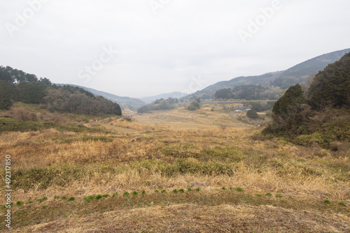 japan, okayama, scarecrow, doll, field, rice field, farming, farmhouse, working, view, mountain, landscape, view, children, parental, adult, peasant, winter, spring, paddy, cold, morning, fog, hat, family, swing, stump, outing, stroll, hike