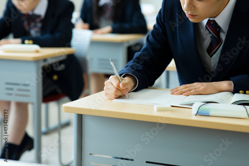 japanese, exam, pen, lifestyle, indoor, school, study, student, training, classroom, contemplate, seated, youth, take, school, write, waist up, people, man, uniform, boy, man, japan, solemn
