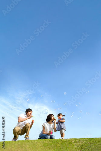 青空を背景にシャボン玉で遊ぶ若い夫婦と幼い娘。家族,親子,幸せ,愛情,育児のイメージ