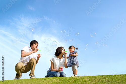 青空を背景に親子でシャボン玉で遊ぶ様子。幸せ,愛情,家族,育児のイメージ