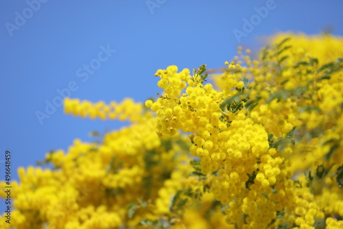 mimosa, flower, yellow, spring, full bloom, wood, nature, sky, landscape, blue, green, plant, leaf, season, outdoors, grass, flowering, light, round, blue skies