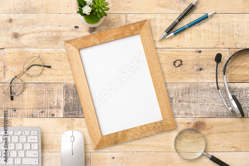 copy space, business, table, desk, whiteboard, unmanned, table, keyboard, mouse, personal computer, office, aerial, woody, image, background, stationery, work, closeup, up, board, panel, space, telecommuting, blank space, ball pen, glasses, houseplant, headset