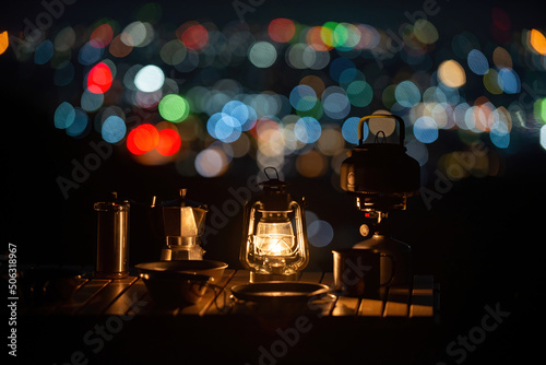 camping, table, lantern, kettle, coffee, drink, drink, mill, coffee grinder, burner, gas burner, nature, vacation, relax, outside, outdoors, dish, meal, leisure, vacation, fire, flames, dusk, sky, view, copy space, light, nightscape