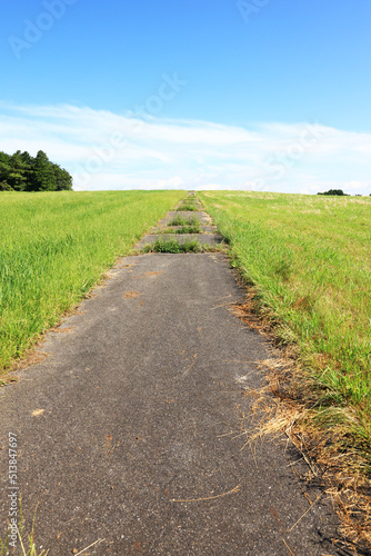 ranch, grass, cloud, blue, green, verdure, nature, landscape, blue skies, open air, sky, plant, copy space, lawn, immensity, bird, route, asphalt, sunny, summer, farming, japan, countryside, way, field, grass, green, meadow, travel, view, field, light, refreshing, crop