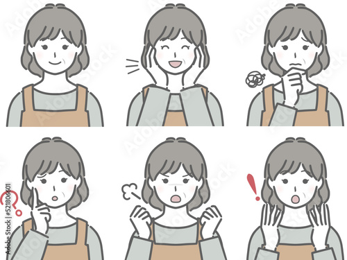 エプロンの中年女性の色々な表情