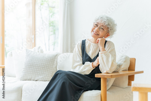 aged, relax, relax, contemplate, smile, woman, japanese, asian, 60's, aged, elderly, aged, babushka, house, home, room, couch, couch, armrest, second life, health, lively, vacation, break, rest, thought, thinking, imagination, regard, smile, light, refreshing, glasses, happy, happiness, fun, joyful, people
