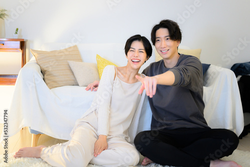 夜に動画やテレビなどを見てくつろぐカップル 広角