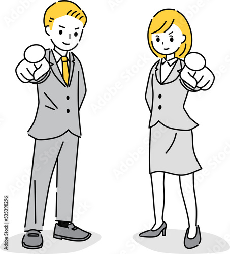 businessman, woman, man, illustration, aim, barometer, hustle, smile, business, finger, aim, suit, pose, expression, spirit, people, sweet, cartoon, humor, unique, hand, employee, woman, two people, salaried employee, ol, pointing, starting, training, vector, japanese