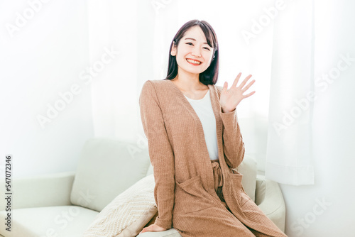 ソファに座って手を振るパジャマ姿の女性(挨拶・同棲)