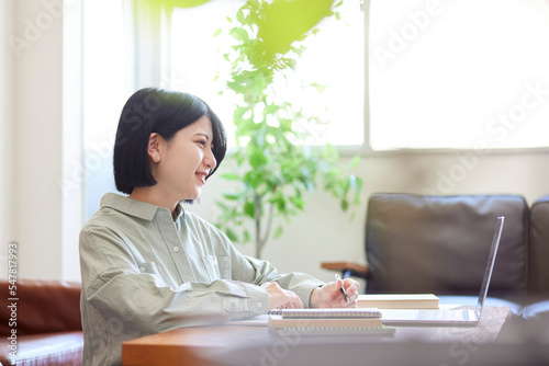 woman, people, japanese, student, young, japan, fall, indoor, room, house, indoor, black hair, healthy, refreshing, houseplant, seated, couch, furniture, chair, study, learning, learn, online, text, noto, pen, write, smile, notebook, personal computer, table, light, daytime, sweet, waist up