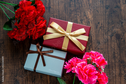 gift, gift, gift, ribbon, box, christmas, container, birthday, valentine, wrapping, copy space, indoor, anniversary, event, decoration, ornament, gratitude, wrap, christmas gift, mother's day, celebration, give, grain, wood, table, aerial, happy, carnation, flower, thank you, bouquet