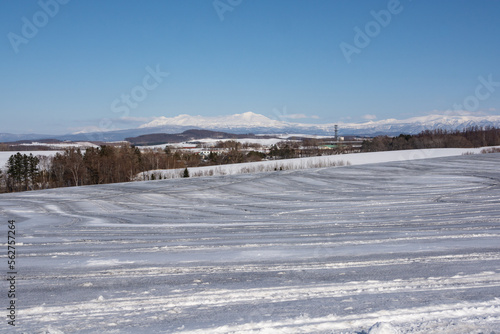 冬の晴れた日の融雪剤がまかれた畑と雪山 大雪山