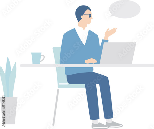 business, businessman, man, personal computer, speaking, person, notebook, cyberspace, online, conversation, communication, telecommuting, desk, chair, seated, drink, mug, houseplant, designer, programmer, engineer, freelance, management, employee, salaried employee, office, work, flat, vector, blue