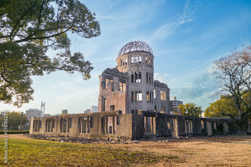 広島県の原爆ドーム、青空の背景