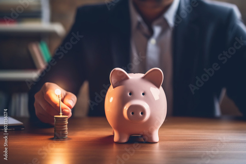 돼지저금통과 돈, 소비 습관을 기록하는 남자. 인공지능 생성