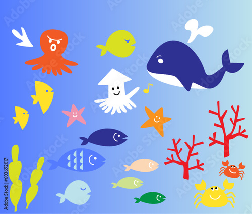 dive, snorkeling, fish, whale, octopus, vector, whale, octopus, fish, sea, coral, starfish, cuttlefish, coral, picture book, crab, sweet, pretty, background, marin, illustration, colourful, blue, sea, nature, water, summer, design, aquarium, biology, handwriting, loose, creature, fishing, travel