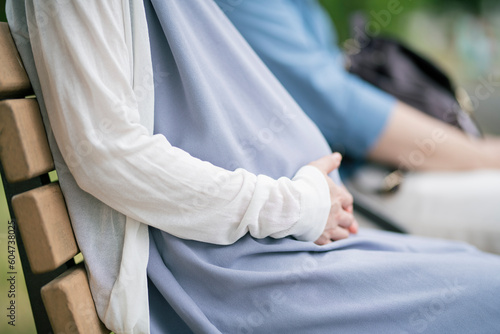 woman, man, couple, pregnancy, mother-to-be, family, family, people, portrait, japanese, asian, two people, 30s, maternity, lifestyle, relax, young, honeymooners, couple, chum, happy, smile, open air, japan, park, tenderness, gentle, caring, seated, bench, walk, new life, copy space, speaking, touch, anonymous, hand, stomach