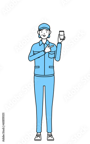 スマホのキャッシュレス・オンライン決済を勧める帽子と作業着姿のシニア女性(経営者、管理職、上司)