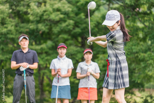 ゴルフ場でゴルフをする女性とスイングを見る男女のゴルファー