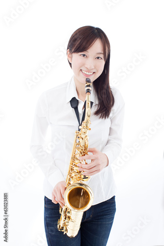 woman, girl, saxophone, saxophone, horn, instrument, performance, blow, music, music, exercise, pursuit, art, smile, sweet, fun, young, people, portrait, model, alone, japanese, asian, white, background, copy space