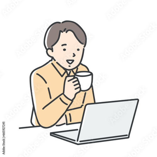 man, young, personal computer, look, search, online, operation, personal computer, notebook, table, tea, cup, coffee, relax, smile, net, communication, cyberspace, shopping, call, application, insurance, web, examine, people, illustration, vector, 30s, white background