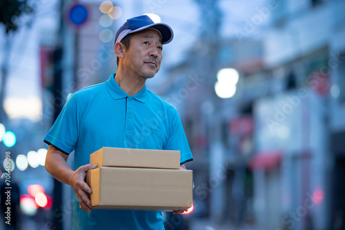 delivery, man, courier service, delivery man, 50's, middle-aged, night, evening, hall, condo, house, home, business, work, work, people, japanese, driver, cardboard, deliver, baggage, carry, person, logistic, drive, good, smile, container, uniform, service, carrier, transport, byte, sideline, freelance, delivery, courier, businessman