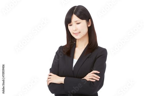 woman, ol, work, business, suit, job hunting, recruit, contemplate, sad, hesitate, apprehension, unrest, ambivalence, trouble, regret, fatigue, overwork, sluggish, weary, japanese, japan, asian, white background, sweet, young, pretty, clean, alone, isolated, girl