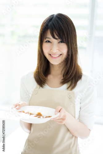 woman, homemaker, apron, housekeeping, dish, curry, food, meal, health, cosmetic, alimentation, vitamin, diet, calorie, diet, smile, black hair, young, sweet, girl, people, portrait, japanese, asian, model, white, background, copy space, house, kitchen, home, clerk, staff, eatery, coffee, home