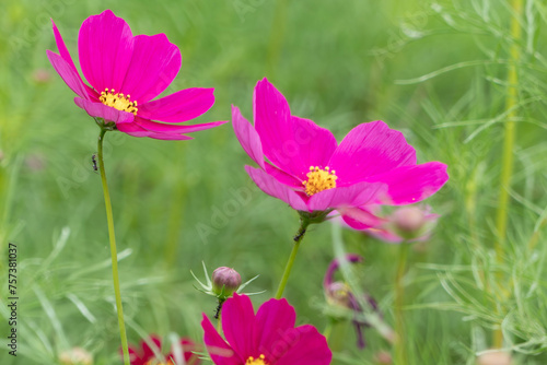 cosmos, fall, flower petals, zoom, up, pretty, lovely, nature, green, green, pitiful, insect, pink, red, colourful, colours, copy space, japan, asia