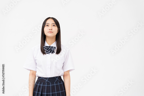 制服を着た日本人女子高校生のポートーレート/白背景スタジオ撮影