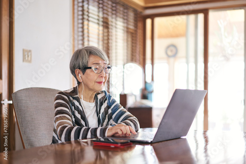 パソコンを使うグレイヘアの日本人シニア女性