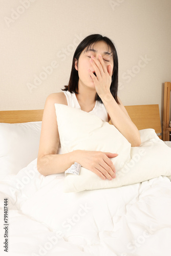 uprise, drowsy, yawn, awakening, awake, sleep, go to bed, nap, slumber, insomnia, doze, siesta, break, sleep, bed, overwork, fatigue, bedchamber, fatigue, hypnotic, bedchamber, lie, sleep, morning, lie, snooze, room, woman, japanese, young, indoor, indoor