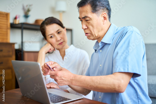 aged, couple, cyberspace, phishing, credit card, man, personal computer, notebook, card, pin, clearing, bank, deposit, account, nest egg, lifestyle, second life, pension, aged, 60's, japanese, people, waist up, two people, shopping, smile, copy space, affirmation, registry, lying, aged, payment, crime, password, security