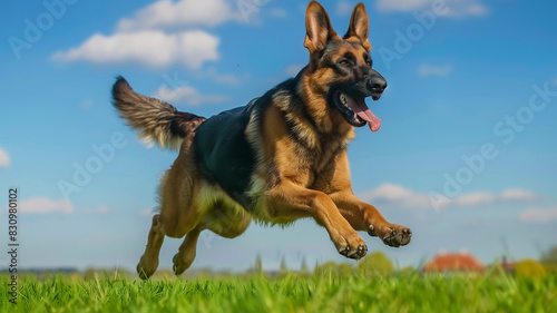 ジャーマン・シェパードが広い緑の芝生を駆け抜ける