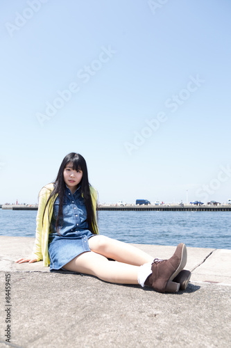 woman, girl, japanese, people, model, pretty, young, baby face, seated, smile, smile, smile, pier, levee, break, sea, beach, beach, beach, kanagawa