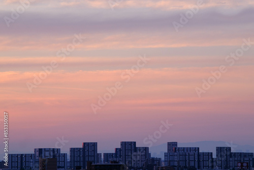 神戸市東灘区のマンションの高層階からの夜明け。空がオレンジ色からブルーのグラデーションに染まる