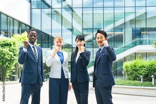 オフィスビルの前でガッツポーズする多国籍ビジネスパーソンのグループ