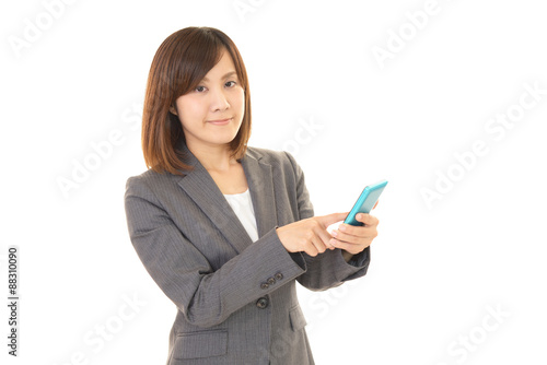 woman, people, people, business, work, smartphone, smartphone, cyberspace, mobile phone, call, operation, mobile, iphone, woman, sweet, pretty, adult, young, ol, office, corporation, corporate, work, suit, shirt, expression, face, smile, smile, smile, lively, flop, model, beauty, girl, happy, happiness, health, cosmetic, object, alone, japanese, asian, copy space, waist up, white background