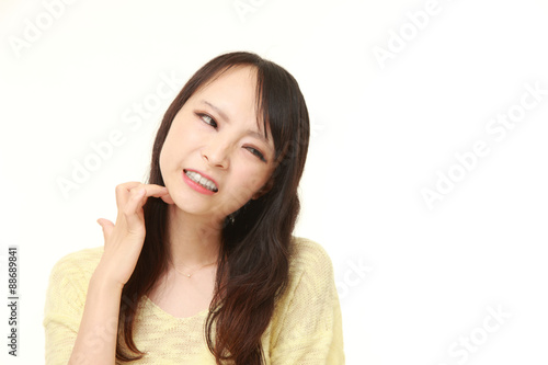 itch, itchy, itch, dermatitis, bite, eczema, eruption, woman, sky blue, japanese, asian, alone, white background, woman, long hair, young, yellow, skeletal, smart, slim