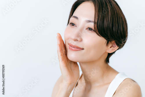 cosmetic, smile, beauty, woman, natural, skincare, middle-aged, face, este, facial, cheek, beauty, indoor, indoor, smile, hand, light, copy space, health care, pretty, white background, camisole, singlet, portrait, health, japanese, people, relax