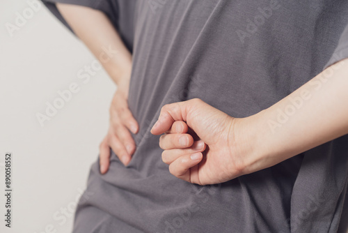 hip, woman, backache, painful, pain, people, 50's, hand, japanese, closeup, back, stretching, massage, fatigue, fatigue, stern, spicey, attitude, fist, push, unravel