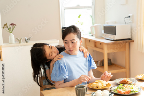 table, mother, girl, kitchen, communication, salad, dining table, dining room, table, natural, bread, bedchamber, child rearing, indoor, house, family, conversation, happy, children, dish, people, chum, morning, breakfast, two people, japanese, life, mother, egg